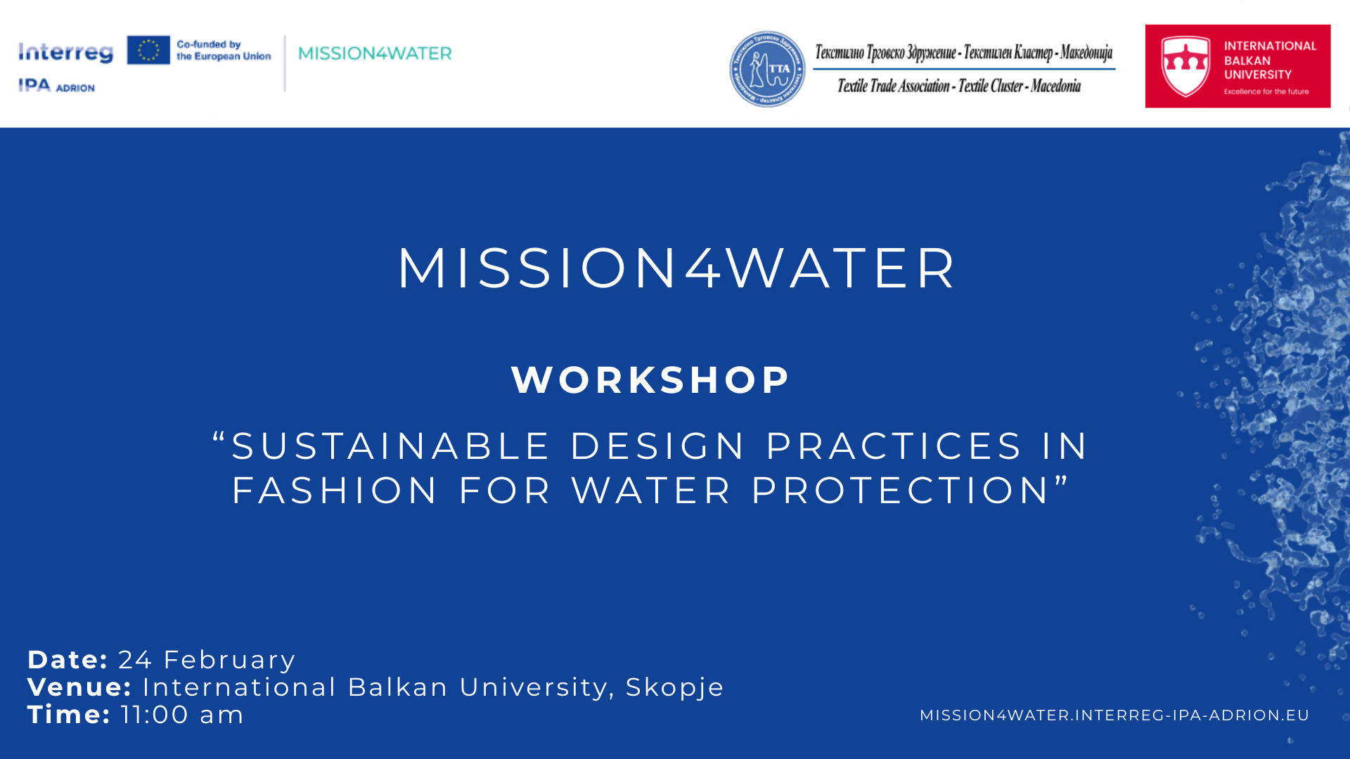 Текстилната трговска асоцијација – Текстилен кластер, во соработка со Меѓународниот Балкански Универзитет, организираше работилница во рамки на проектот Mission4Water насловена „Sustainable Design Practices in Fashion for Water Protection“, која се одржа на 24 февруари 2026 година во просториите на Факултетот за уметност и дизајн при Меѓународниот Балкански Универзитет. Целта на работилницата беше подигање на свеста и промоција на одржливи дизајнерски пристапи насочени кон заштита на водата и намалување на загадувањето во текстилниот сектор.